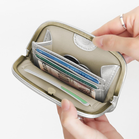 打開鐮刀口的時候,只需從背面按一下上部中心就可以簡單地打開。裡面有零錢盒和3個卡口袋,可以收納3折的紙幣。